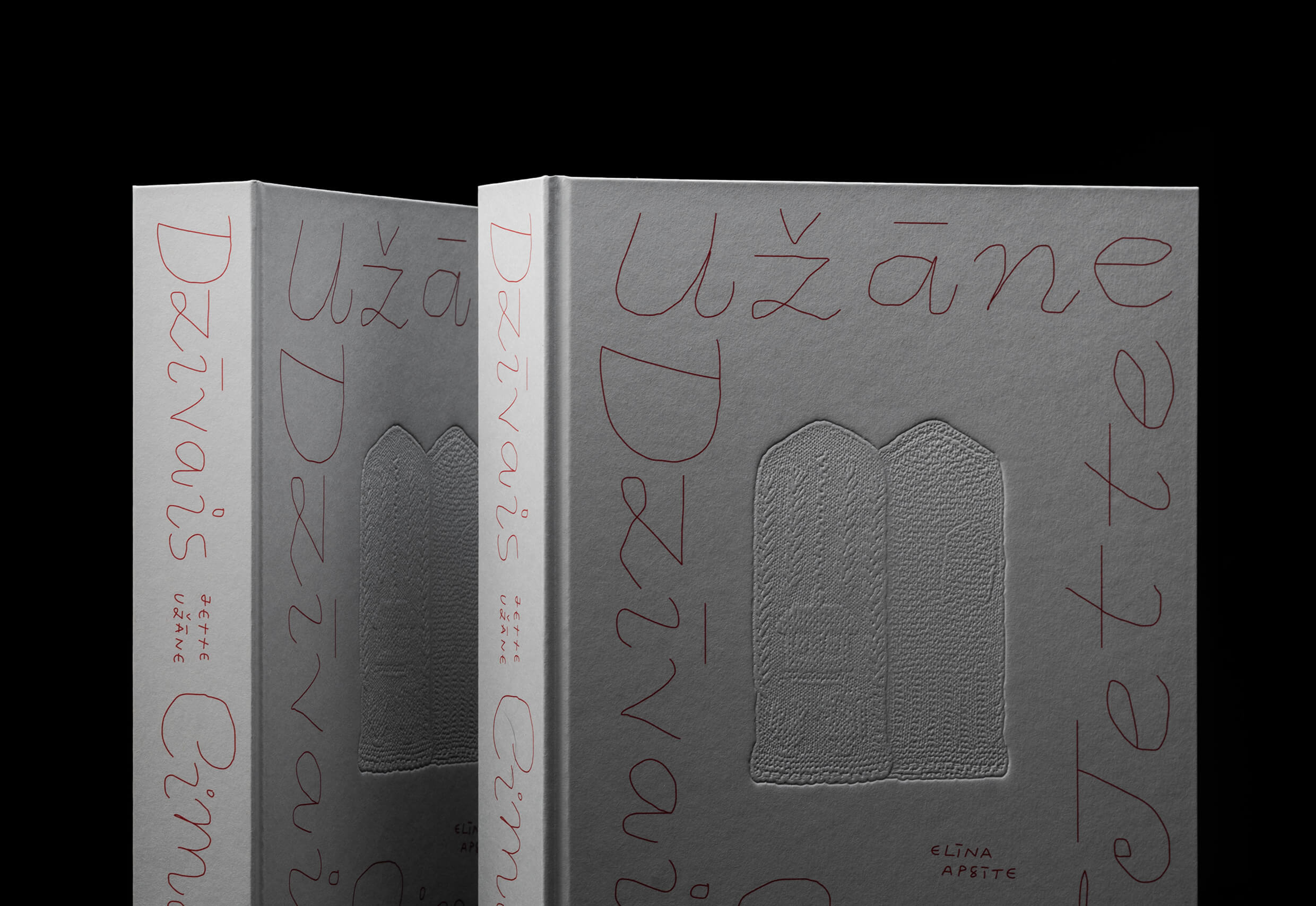 The central element of the book cover is a tactile emboss reproduction of Jette Užāne’s knitted mittens. As Jette said, “drawing with white on white,” showing that the material itself is a self-sufficient tool that allows the texture of a knitted mitten to be communicated more physically and directly than a photographic reproduction could. So the mittens on the cover of the book were “drawn” using only light and shadow.